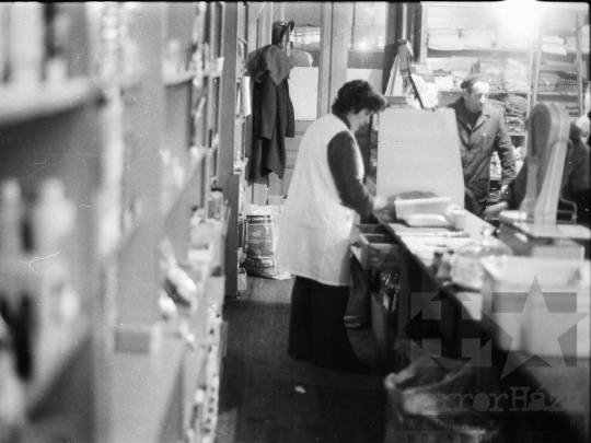 élelmiszer bolt üzlet mérleg áru vásárló pult eladó köpeny népbolt Mucsi Tolna megye Magyarország 1976 Bakó JenőFotó részletei