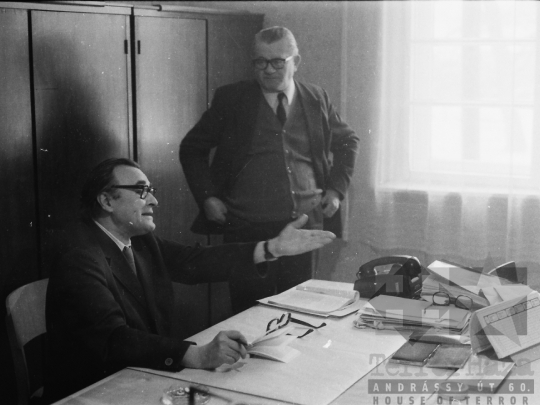 munkahelyi élet iroda íróasztal telefon határidő napló szemüveg pecsétpárna Mucsi Tolna megye 1976 Bakó Jenő MagyarországFotó részletei