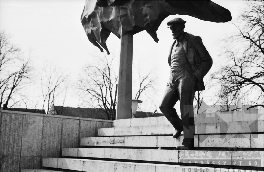 AZONOSÍTÓ: THM-BJ-00717 Férfi beszédet mond - transzparensen felirat: "Munkánk minőségének és hatékonyságának javításával, többletvállalásokkal készülünk a NAGY OKT. SZOC. FORR. 60. évfordulójára". [Az októberi orosz forradalom (kommunista propagandában: nagy októberi szocialista forradalom) 1917. november 6–12. (október 24–30.) között zajlott, amelynek során a bolsevikok a Téli Palota ostroma után az ott székelő Ideiglenes Kormány tagjait letartóztatták, és Lenin vezetésével, akit a Népbiztosok Tanácsa elnökévé választottak, puccsal átvették a hatalmat. Hazánkban ez a nap 1950-től 1989-ig pártállami ünnep volt.] [A szocialista brigádmozgalom szovjet mintára az 1950-es évek végén kezdett kibontakozni Magyarországon, és rendszerváltoztatáskor szűnt meg. Kezdetben csak az ipari üzemekben és gyárakban alakultak meg a brigádok, majd az agráriumban és a hivatali szférában is létrejöttek. A mozgalom jelszava: „Szocialista módon dolgozni, tanulni és élni” volt.] HELYSZÍN: Szekszárd, Tolna megye DÁTUM: 1977 FOTÓS: Bakó Jenő