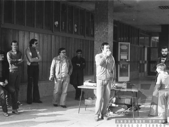 AZONOSÍTÓ: THM-BJ-00717 Férfi beszédet mond - transzparensen felirat: "Munkánk minőségének és hatékonyságának javításával, többletvállalásokkal készülünk a NAGY OKT. SZOC. FORR. 60. évfordulójára". [Az októberi orosz forradalom (kommunista propagandában: nagy októberi szocialista forradalom) 1917. november 6–12. (október 24–30.) között zajlott, amelynek során a bolsevikok a Téli Palota ostroma után az ott székelő Ideiglenes Kormány tagjait letartóztatták, és Lenin vezetésével, akit a Népbiztosok Tanácsa elnökévé választottak, puccsal átvették a hatalmat. Hazánkban ez a nap 1950-től 1989-ig pártállami ünnep volt.] [A szocialista brigádmozgalom szovjet mintára az 1950-es évek végén kezdett kibontakozni Magyarországon, és rendszerváltoztatáskor szűnt meg. Kezdetben csak az ipari üzemekben és gyárakban alakultak meg a brigádok, majd az agráriumban és a hivatali szférában is létrejöttek. A mozgalom jelszava: „Szocialista módon dolgozni, tanulni és élni” volt.] HELYSZÍN: Szekszárd, Tolna megye DÁTUM: 1977 FOTÓS: Bakó Jenő