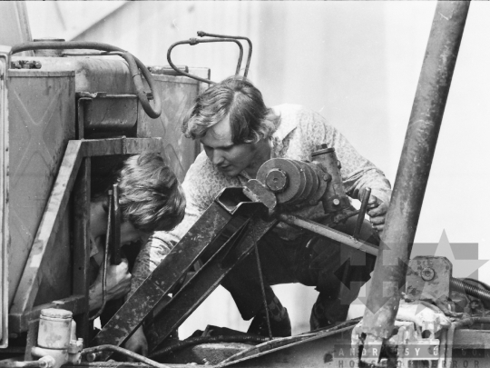AZONOSÍTÓ: THM-BJ-00717 Férfi beszédet mond - transzparensen felirat: "Munkánk minőségének és hatékonyságának javításával, többletvállalásokkal készülünk a NAGY OKT. SZOC. FORR. 60. évfordulójára". [Az októberi orosz forradalom (kommunista propagandában: nagy októberi szocialista forradalom) 1917. november 6–12. (október 24–30.) között zajlott, amelynek során a bolsevikok a Téli Palota ostroma után az ott székelő Ideiglenes Kormány tagjait letartóztatták, és Lenin vezetésével, akit a Népbiztosok Tanácsa elnökévé választottak, puccsal átvették a hatalmat. Hazánkban ez a nap 1950-től 1989-ig pártállami ünnep volt.] [A szocialista brigádmozgalom szovjet mintára az 1950-es évek végén kezdett kibontakozni Magyarországon, és rendszerváltoztatáskor szűnt meg. Kezdetben csak az ipari üzemekben és gyárakban alakultak meg a brigádok, majd az agráriumban és a hivatali szférában is létrejöttek. A mozgalom jelszava: „Szocialista módon dolgozni, tanulni és élni” volt.] HELYSZÍN: Szekszárd, Tolna megye DÁTUM: 1977 FOTÓS: Bakó Jenő