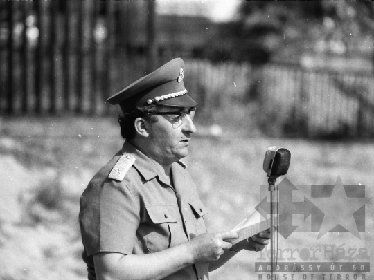 katonaság iskola szakközépiskola honvédelem vetélkedő egyenruha katona tiszt mikrofon beszéd Szekszárd Tolna megye Magyarország 1979 Bakó JenőFotó részletei