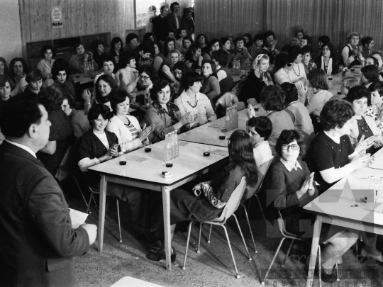 AZONOSÍTÓ: THM-BJ-00716 A rendezvény résztvevői. [A szocialista brigádmozgalom szovjet mintára az 1950-es évek végén kezdett kibontakozni Magyarországon, és rendszerváltoztatáskor szűnt meg. Kezdetben csak az ipari üzemekben és gyárakban alakultak meg a brigádok, majd az agráriumban és a hivatali szférában is létrejöttek. A mozgalom jelszava: „Szocialista módon dolgozni, tanulni és élni” volt.] HELYSZÍN: Szekszárd, Tolna megye DÁTUM: 1977 FOTÓS: Bakó Jenő