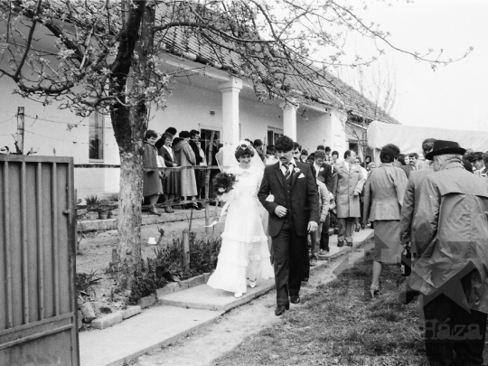 esküvő házasság család ünnepség menyasszony vőlegény násznép tornácos ház csokor Szálka Tolna megye Magyarország 1983 Bakó JenőFotó részletei