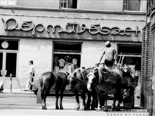 utcakép forgalom lovas kocsi népművészeti bolt neonreklám kirakat belváros Szekszárd Tolna megye Magyarország 1983 Bakó JenőFotó részletei