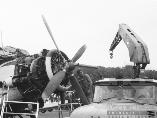katonaság repülőtér haditechnika MHSZ repülőgép szerelés légcsavar darus kocsi Őcsény Tolna megye Magyarország 1983 Bakó JenőFotó részletei