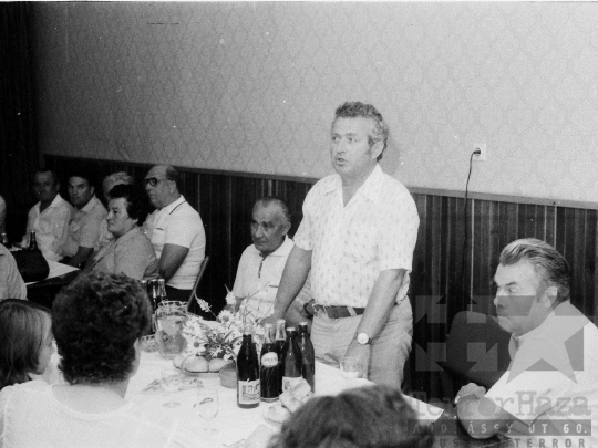 AZONOSÍTÓ: THM-BJ-00714 Férfi beszédet mond. [A szocialista brigádmozgalom szovjet mintára az 1950-es évek végén kezdett kibontakozni Magyarországon, és rendszerváltoztatáskor szűnt meg. Kezdetben csak az ipari üzemekben és gyárakban alakultak meg a brigádok, majd az agráriumban és a hivatali szférában is létrejöttek. A mozgalom jelszava: „Szocialista módon dolgozni, tanulni és élni” volt.] HELYSZÍN: Szekszárd, Tolna megye DÁTUM: 1977 FOTÓS: Bakó Jenő