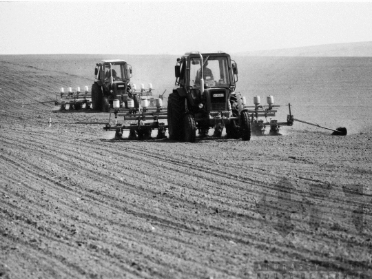 kukorica vetőmag traktor vetés vetőgép termelőszövetkezet Tamási Tolna megye Magyarország 1985 Bakó JenőFotó részletei