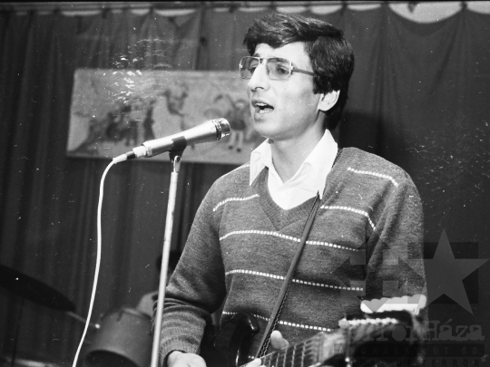 művelődési ház zenész gitár mikrofon színpad öregség Mórágy Tolna megye Magyarország 1985 Bakó JenőFotó részletei