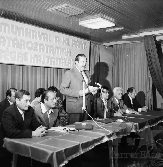 vállalati ünnepség TOTÉV pódium transzparens mikrofon beszéd Szekszárd Tolna megye 1976 Bakó Jenő MagyarországFotó részletei