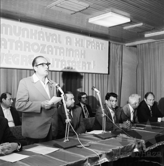 AZONOSÍTÓ: THM-BJ-00714 Férfi beszédet mond. [A szocialista brigádmozgalom szovjet mintára az 1950-es évek végén kezdett kibontakozni Magyarországon, és rendszerváltoztatáskor szűnt meg. Kezdetben csak az ipari üzemekben és gyárakban alakultak meg a brigádok, majd az agráriumban és a hivatali szférában is létrejöttek. A mozgalom jelszava: „Szocialista módon dolgozni, tanulni és élni” volt.] HELYSZÍN: Szekszárd, Tolna megye DÁTUM: 1977 FOTÓS: Bakó Jenő
