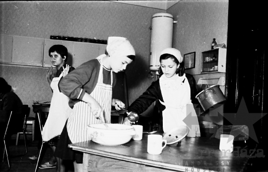 általános iskola diák iskola tanterem technika óra kötény tankonyha Szekszárd Tolna megye Magyarország 1965 Bakó JenőFotó részletei
