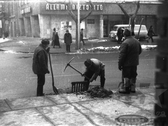 utcakép Állami Biztosító neonreklám csatorna köztisztaság higiénia lapát csákány kucsma furgon Robur usánka Szekszárd Tolna megye Magyarország 1976 Bakó JenőFotó részletei