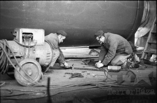 AZONOSÍTÓ: THM-BJ-00717 Férfi beszédet mond - transzparensen felirat: "Munkánk minőségének és hatékonyságának javításával, többletvállalásokkal készülünk a NAGY OKT. SZOC. FORR. 60. évfordulójára". [Az októberi orosz forradalom (kommunista propagandában: nagy októberi szocialista forradalom) 1917. november 6–12. (október 24–30.) között zajlott, amelynek során a bolsevikok a Téli Palota ostroma után az ott székelő Ideiglenes Kormány tagjait letartóztatták, és Lenin vezetésével, akit a Népbiztosok Tanácsa elnökévé választottak, puccsal átvették a hatalmat. Hazánkban ez a nap 1950-től 1989-ig pártállami ünnep volt.] [A szocialista brigádmozgalom szovjet mintára az 1950-es évek végén kezdett kibontakozni Magyarországon, és rendszerváltoztatáskor szűnt meg. Kezdetben csak az ipari üzemekben és gyárakban alakultak meg a brigádok, majd az agráriumban és a hivatali szférában is létrejöttek. A mozgalom jelszava: „Szocialista módon dolgozni, tanulni és élni” volt.] HELYSZÍN: Szekszárd, Tolna megye DÁTUM: 1977 FOTÓS: Bakó Jenő