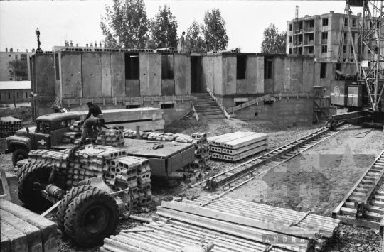 építkezés panelház panelelem lakótelep daru Volán Csepel teherautó Tamási Tolna megye Magyarország 1978 Bakó JenőFotó részletei