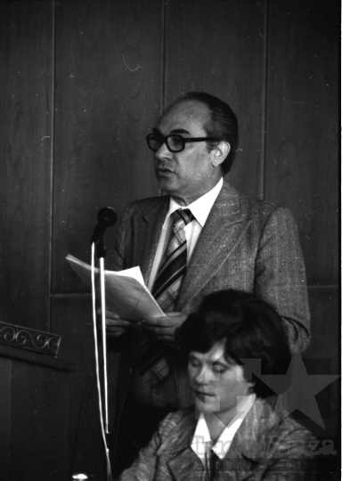 AZONOSÍTÓ: THM-BJ-00714 Férfi beszédet mond. [A szocialista brigádmozgalom szovjet mintára az 1950-es évek végén kezdett kibontakozni Magyarországon, és rendszerváltoztatáskor szűnt meg. Kezdetben csak az ipari üzemekben és gyárakban alakultak meg a brigádok, majd az agráriumban és a hivatali szférában is létrejöttek. A mozgalom jelszava: „Szocialista módon dolgozni, tanulni és élni” volt.] HELYSZÍN: Szekszárd, Tolna megye DÁTUM: 1977 FOTÓS: Bakó Jenő