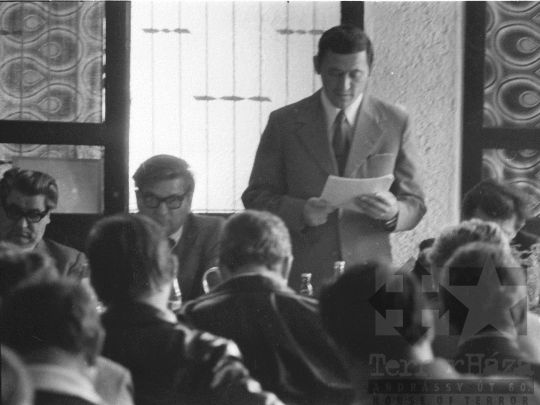 AZONOSÍTÓ: THM-BJ-00714 Férfi beszédet mond. [A szocialista brigádmozgalom szovjet mintára az 1950-es évek végén kezdett kibontakozni Magyarországon, és rendszerváltoztatáskor szűnt meg. Kezdetben csak az ipari üzemekben és gyárakban alakultak meg a brigádok, majd az agráriumban és a hivatali szférában is létrejöttek. A mozgalom jelszava: „Szocialista módon dolgozni, tanulni és élni” volt.] HELYSZÍN: Szekszárd, Tolna megye DÁTUM: 1977 FOTÓS: Bakó Jenő