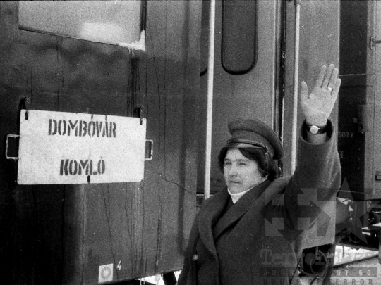 kalauz pályaudvar vonattábla vasút vasutas egyenruha szerelvény szállítás Dombóvár Tolna megye Magyarország 1981 Bakó JenőFotó részletei