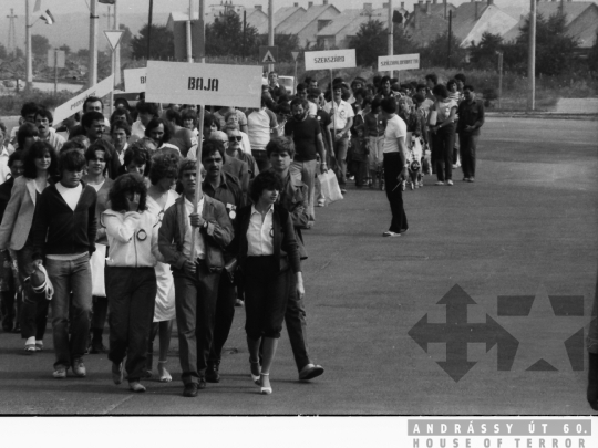 AZONOSÍTÓ: THM-BJ-00715 A rendezvény résztvevői. [A szocialista brigádmozgalom szovjet mintára az 1950-es évek végén kezdett kibontakozni Magyarországon, és rendszerváltoztatáskor szűnt meg. Kezdetben csak az ipari üzemekben és gyárakban alakultak meg a brigádok, majd az agráriumban és a hivatali szférában is létrejöttek. A mozgalom jelszava: „Szocialista módon dolgozni, tanulni és élni” volt.] HELYSZÍN: Szekszárd, Tolna megye DÁTUM: 1977 FOTÓS: Bakó Jenő