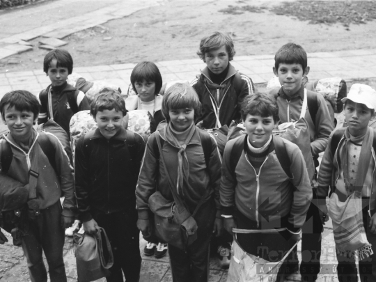 gyerek nyakkendő úttörő túra melegítő kirándulás ifjúsági mozgalmi élet Szekszárd Tolna megye Magyarország 1983 Bakó JenőFotó részletei