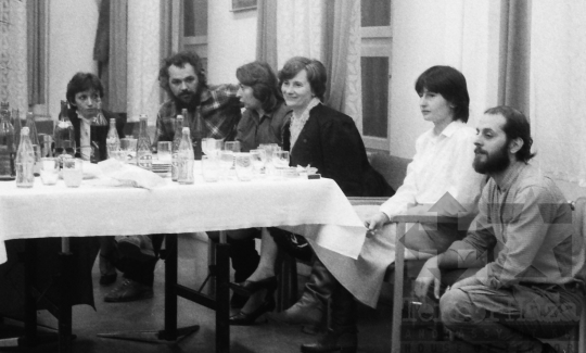 AZONOSÍTÓ: THM-BJ-00740 Zenészek asztal mellett játszanak. [TOTÉV: Tolna megyei Tatarozó és Építő Vállalat 1950. október végén a megyeszerte működő kisipari szövetkezetek összevonásával alakult meg, 1968 közepére szocialista középvállalattá nőtte ki magát Tm. Tanácsi Építőipari Vállalat néven.] HELYSZÍN: Szekszárd, Tolna megye DÁTUM: 1977 FOTÓS: Bakó Jenő
