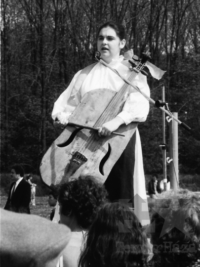 szocialista állami ünnep május 1. munka ünnepe színpad majális népviselet ütőgardon zenész Bonyhád Tolna megye Magyarország 1985 Bakó JenőFotó részletei