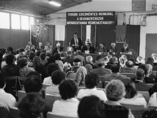 termelőszövetkezet közgyűlés beszéd pódium zászló transzparens mikrofon Felsőnána Tolna megye Magyarország 1985 Bakó JenőFotó részletei