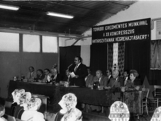 AZONOSÍTÓ: THM-BJ-00718 Néptánc produkció a színpadon - transzparenseken feliratok: "Hatékonyabb munkával a XI. pártkongresszus határozatainak következetes végrehajtásáért" "Munkánk minőségének és hatékonyságának javításával, többletvállalásokkal készülünk a NAGY OKT. SZOC. FORR. 60. évfordulójára". [Az októberi orosz forradalom (kommunista propagandában: nagy októberi szocialista forradalom) 1917. november 6–12. (október 24–30.) között zajlott, amelynek során a bolsevikok a Téli Palota ostroma után az ott székelő Ideiglenes Kormány tagjait letartóztatták, és Lenin vezetésével, akit a Népbiztosok Tanácsa elnökévé választottak, puccsal átvették a hatalmat. Hazánkban ez a nap 1950-től 1989-ig pártállami ünnep volt.] [A szocialista brigádmozgalom szovjet mintára az 1950-es évek végén kezdett kibontakozni Magyarországon, és rendszerváltoztatáskor szűnt meg. Kezdetben csak az ipari üzemekben és gyárakban alakultak meg a brigádok, majd az agráriumban és a hivatali szférában is létrejöttek. A mozgalom jelszava: „Szocialista módon dolgozni, tanulni és élni” volt.] HELYSZÍN: Szekszárd, Tolna megye DÁTUM: 1977 FOTÓS: Bakó Jenő