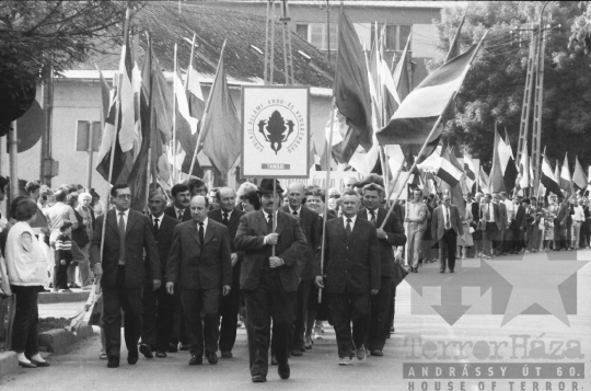 szocialista állami ünnep május 1. munka ünnepe zászló transzparens felvonulás állami gazdaság Tamási Tolna megye Magyarország 1985 Bakó JenőFotó részletei