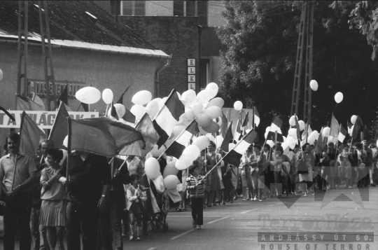 szocialista állami ünnep május 1. munka ünnepe zászló transzparens lufi felvonulás Tamási Tolna megye Magyarország 1985 Bakó JenőFotó részletei
