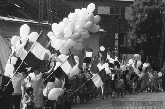 szocialista állami ünnep május 1. munka ünnepe zászló transzparens lufi felvonulás Tamási Tolna megye Magyarország 1985 Bakó JenőFotó részletei