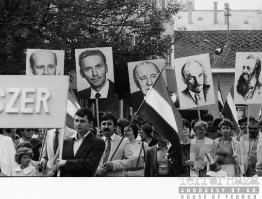 Felvonulók Losonczi Pált, Lázár Györgyöt, Kádár Jánost, Lenint és Engelst ábrázoló transzparensekkel.