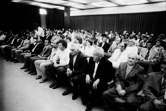 AZONOSÍTÓ: THM-BJ-00716a A rendezvény résztvevői. [A szocialista brigádmozgalom szovjet mintára az 1950-es évek végén kezdett kibontakozni Magyarországon, és rendszerváltoztatáskor szűnt meg. Kezdetben csak az ipari üzemekben és gyárakban alakultak meg a brigádok, majd az agráriumban és a hivatali szférában is létrejöttek. A mozgalom jelszava: „Szocialista módon dolgozni, tanulni és élni” volt.] HELYSZÍN: Szekszárd, Tolna megye DÁTUM: 1977 FOTÓS: Bakó Jenő