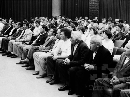 AZONOSÍTÓ: THM-BJ-00716a A rendezvény résztvevői. [A szocialista brigádmozgalom szovjet mintára az 1950-es évek végén kezdett kibontakozni Magyarországon, és rendszerváltoztatáskor szűnt meg. Kezdetben csak az ipari üzemekben és gyárakban alakultak meg a brigádok, majd az agráriumban és a hivatali szférában is létrejöttek. A mozgalom jelszava: „Szocialista módon dolgozni, tanulni és élni” volt.] HELYSZÍN: Szekszárd, Tolna megye DÁTUM: 1977 FOTÓS: Bakó Jenő