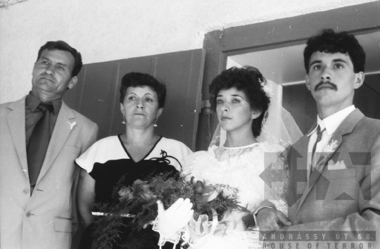 esküvő házasság család ünnep menyasszony vőlegény örömapa örömanya csokor Mórágy Tolna megye Magyarország 1986 Bakó JenőFotó részletei
