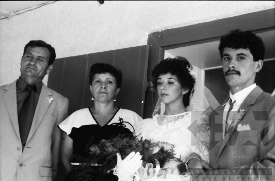 esküvő házasság család ünnep menyasszony vőlegény örömapa örömanya csokor Mórágy Tolna megye Magyarország 1986 Bakó JenőFotó részletei