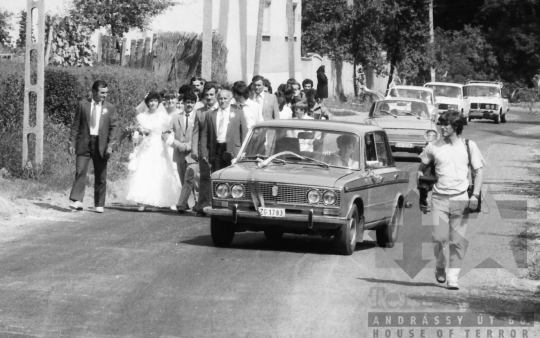 esküvő házasság család ünnep násznép Lada autó rendszám videokamera utcakép Mórágy Tolna megye Magyarország 1986 Bakó JenőFotó részletei