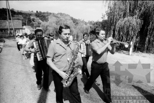 esküvő házasság család ünnep násznép zenész trombita tangóharmonika szaxofon utcakép Mórágy Tolna megye Magyarország 1986 Bakó JenőFotó részletei