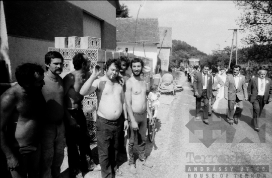 esküvő házasság család ünnep násznép tégla munkás utcakép Mórágy Tolna megye Magyarország 1986 Bakó Jenő