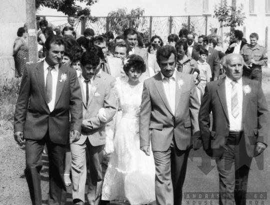 esküvő házasság család ünnep násznép menyasszony vőlegény utcakép Mórágy Tolna megye Magyarország 1986 Bakó JenőFotó részletei