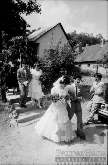 esküvő házasság család ünnep menyasszony vőlegény csokor utcakép Mórágy Tolna megye Magyarország 1986 Bakó JenőFotó részletei