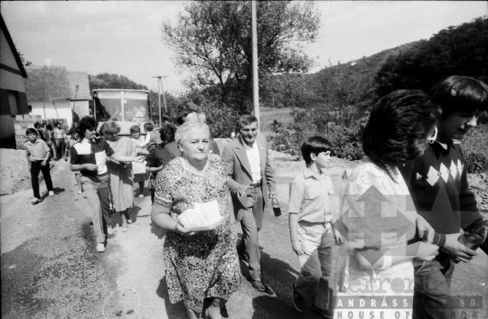 esküvő házasság család ünnep násznép Ikarus busz utcakép Mórágy Tolna megye Magyarország 1986 Bakó JenőFotó részletei