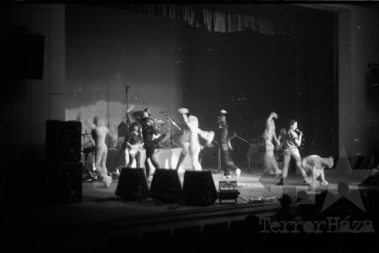 AZONOSÍTÓ: THM-BJ-00718 Néptánc produkció a színpadon - transzparenseken feliratok: "Hatékonyabb munkával a XI. pártkongresszus határozatainak következetes végrehajtásáért" "Munkánk minőségének és hatékonyságának javításával, többletvállalásokkal készülünk a NAGY OKT. SZOC. FORR. 60. évfordulójára". [Az októberi orosz forradalom (kommunista propagandában: nagy októberi szocialista forradalom) 1917. november 6–12. (október 24–30.) között zajlott, amelynek során a bolsevikok a Téli Palota ostroma után az ott székelő Ideiglenes Kormány tagjait letartóztatták, és Lenin vezetésével, akit a Népbiztosok Tanácsa elnökévé választottak, puccsal átvették a hatalmat. Hazánkban ez a nap 1950-től 1989-ig pártállami ünnep volt.] [A szocialista brigádmozgalom szovjet mintára az 1950-es évek végén kezdett kibontakozni Magyarországon, és rendszerváltoztatáskor szűnt meg. Kezdetben csak az ipari üzemekben és gyárakban alakultak meg a brigádok, majd az agráriumban és a hivatali szférában is létrejöttek. A mozgalom jelszava: „Szocialista módon dolgozni, tanulni és élni” volt.] HELYSZÍN: Szekszárd, Tolna megye DÁTUM: 1977 FOTÓS: Bakó Jenő