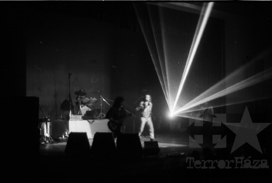 előadás művelődési ház zenekar hangszer mikrofon erősítő gitár dob színpad Bonyhád Tolna megye Magyarország 1987 Bakó JenőFotó részletei
