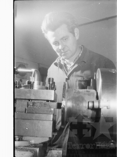 állami gazdaság esztergapad műhely köpeny Hőgyész Tolna megye Magyarország 1962 Bakó JenőFotó részletei