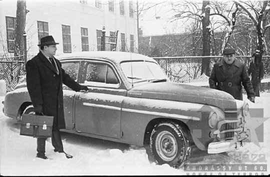 AZONOSÍTÓ: THM-BJ-00717 Férfi beszédet mond - transzparensen felirat: "Munkánk minőségének és hatékonyságának javításával, többletvállalásokkal készülünk a NAGY OKT. SZOC. FORR. 60. évfordulójára". [Az októberi orosz forradalom (kommunista propagandában: nagy októberi szocialista forradalom) 1917. november 6–12. (október 24–30.) között zajlott, amelynek során a bolsevikok a Téli Palota ostroma után az ott székelő Ideiglenes Kormány tagjait letartóztatták, és Lenin vezetésével, akit a Népbiztosok Tanácsa elnökévé választottak, puccsal átvették a hatalmat. Hazánkban ez a nap 1950-től 1989-ig pártállami ünnep volt.] [A szocialista brigádmozgalom szovjet mintára az 1950-es évek végén kezdett kibontakozni Magyarországon, és rendszerváltoztatáskor szűnt meg. Kezdetben csak az ipari üzemekben és gyárakban alakultak meg a brigádok, majd az agráriumban és a hivatali szférában is létrejöttek. A mozgalom jelszava: „Szocialista módon dolgozni, tanulni és élni” volt.] HELYSZÍN: Szekszárd, Tolna megye DÁTUM: 1977 FOTÓS: Bakó Jenő