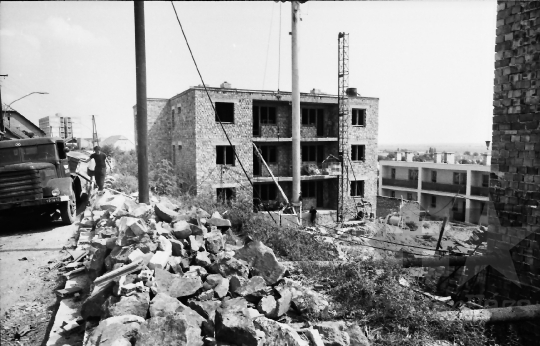 utcakép építkezés tégla daru Csepel teherautó Szekszárd Tolna megye Magyarország 1966 Bakó JenőFotó részletei