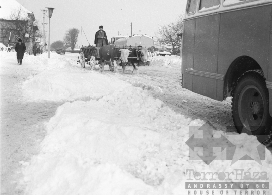 tél hó utcakép szekér szarvasmarha busz Báta Tolna megye Magyarország 1966 Bakó JenőFotó részletei