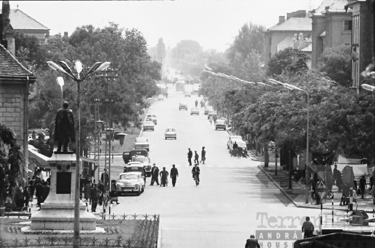 utcakép belváros forgalom autó szobor Szekszárd Tolna megye Magyarország 1967 Bakó JenőFotó részletei
