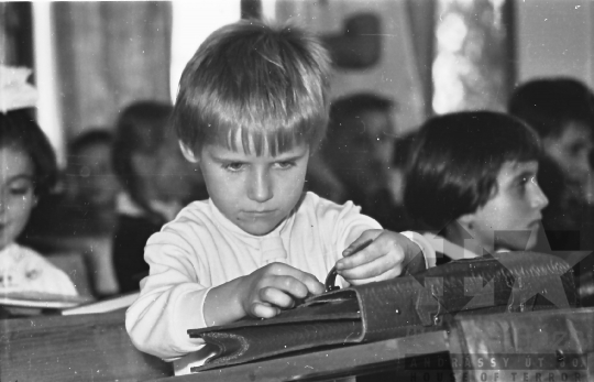 diák iskola általános iskola tanterem ünneplő iskolapad iskolatáska Szekszárd Tolna megye Magyarország 1968 Bakó JenőFotó részletei